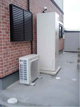 コロナのフルオートタイプ370Lのエコキュートです。給湯器をガスから電気に、それも経済性にとても優れたエコキュートに変更する方が増えています。こちらのお宅では、太陽光発電システムも導入しており、さらに経済効果が上がっています。